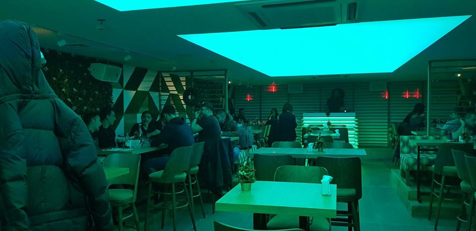 Опънати тавани Clipso с RGB осветление във Hashtag Bar & Dinner град София.Hashtag Bar & Dinner се намира в Милениум Център и e проект на създателите на Unagi sushi.