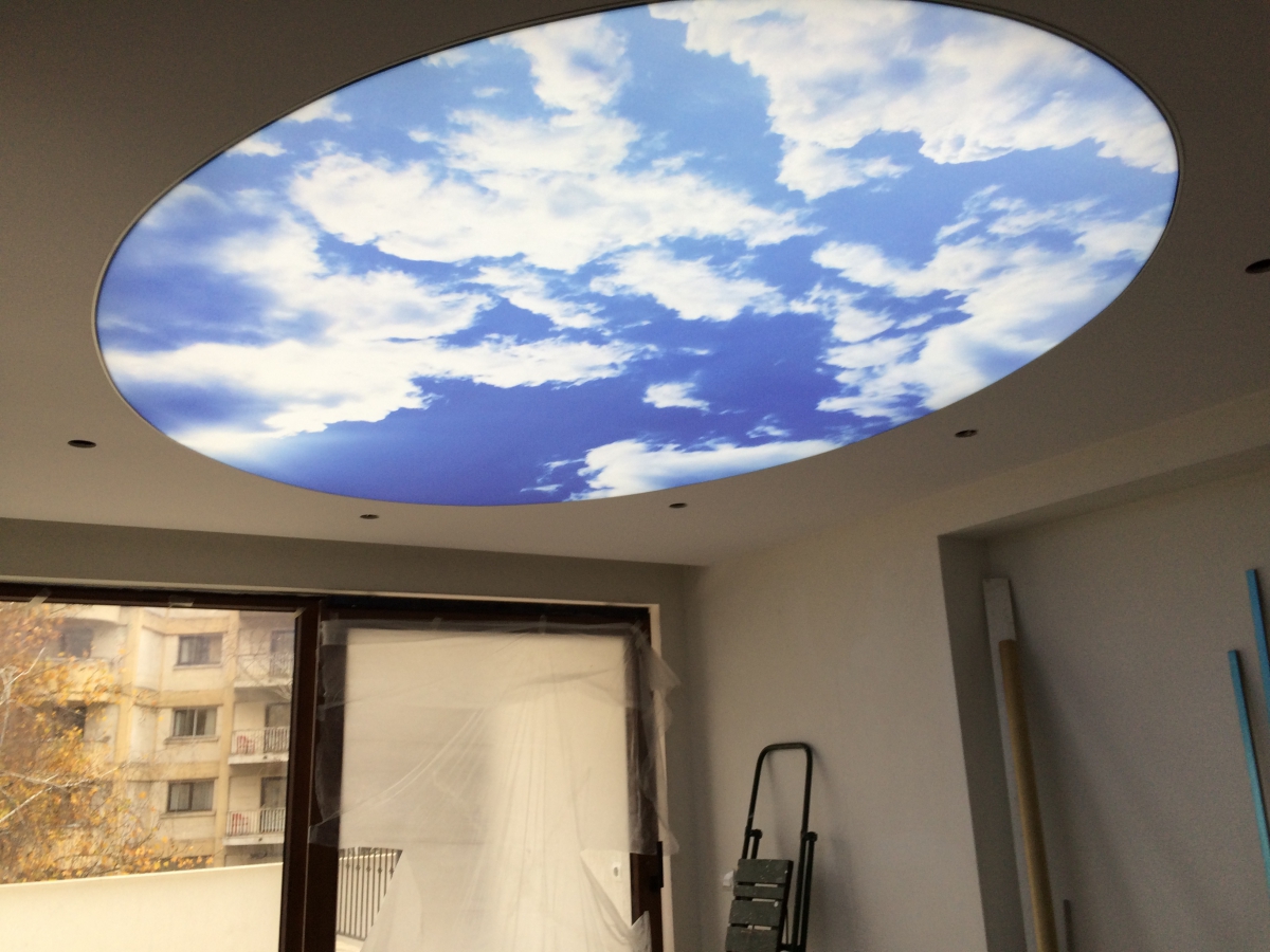 Опънат таван Clipso с лед осветление и принт небе в кухня град Велико Търново