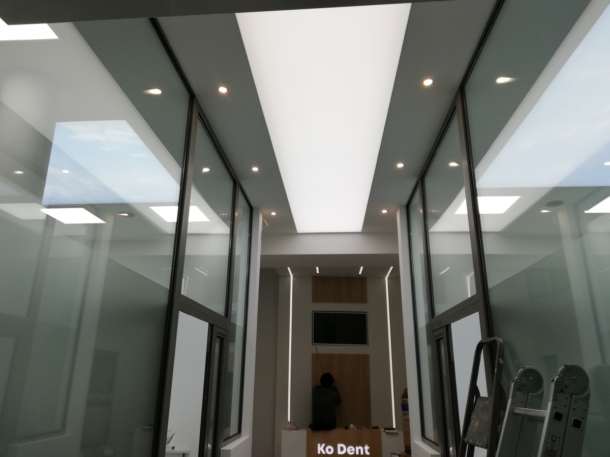 Светещи опънати тавани Clipso с лед осветление, с принт и бели в KoDent Дентална клиника, град София.